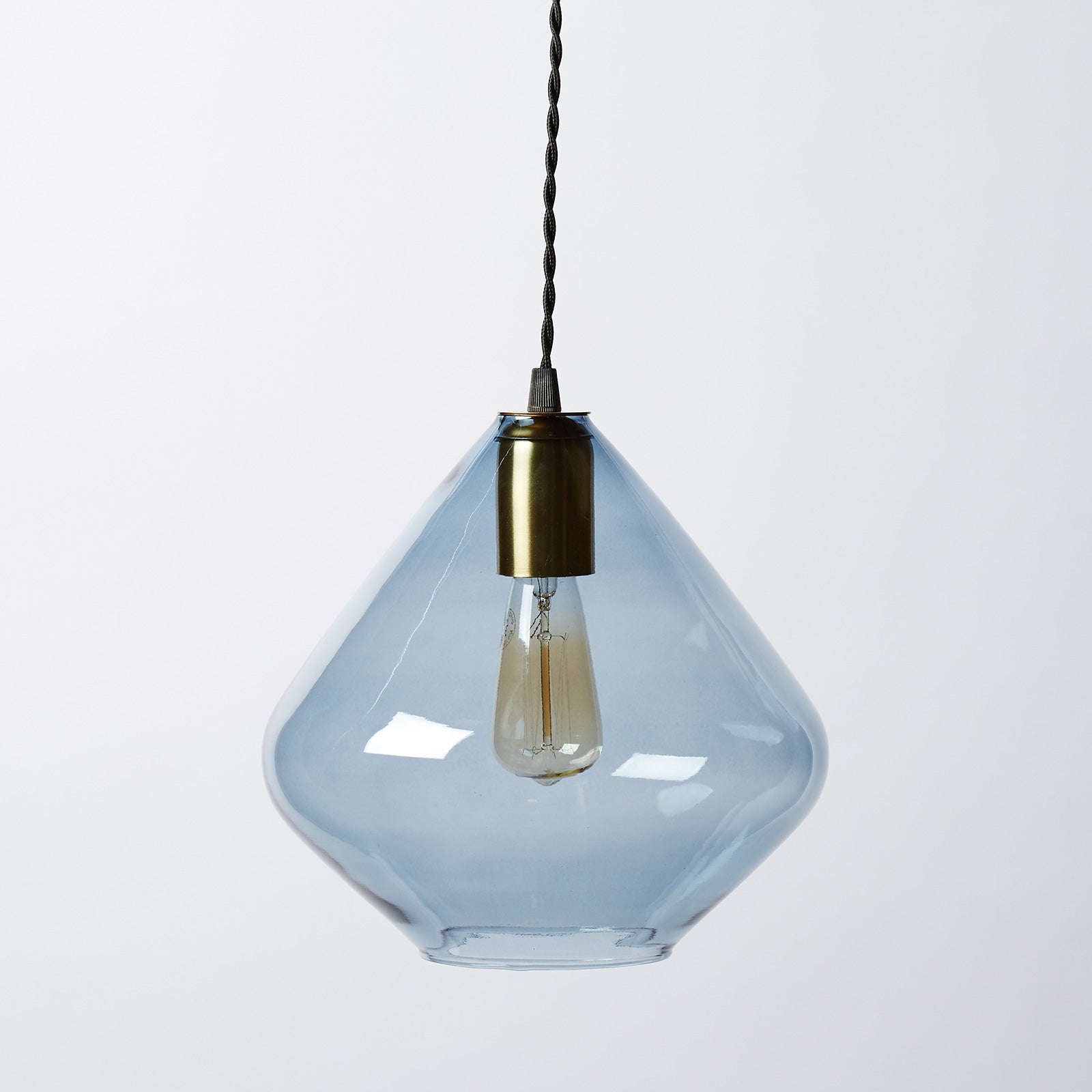 Disponible en una variedad de tonos translúcidos —desde ámbar hasta rosa pálido, desde ahumado hasta azul profundo— cada pieza está hecha a mano, lo que garantiza un carácter único y un acabado artesanal. El detalle metálico en la base de la lámpara añade sofisticación y un sutil contraste contemporáneo.