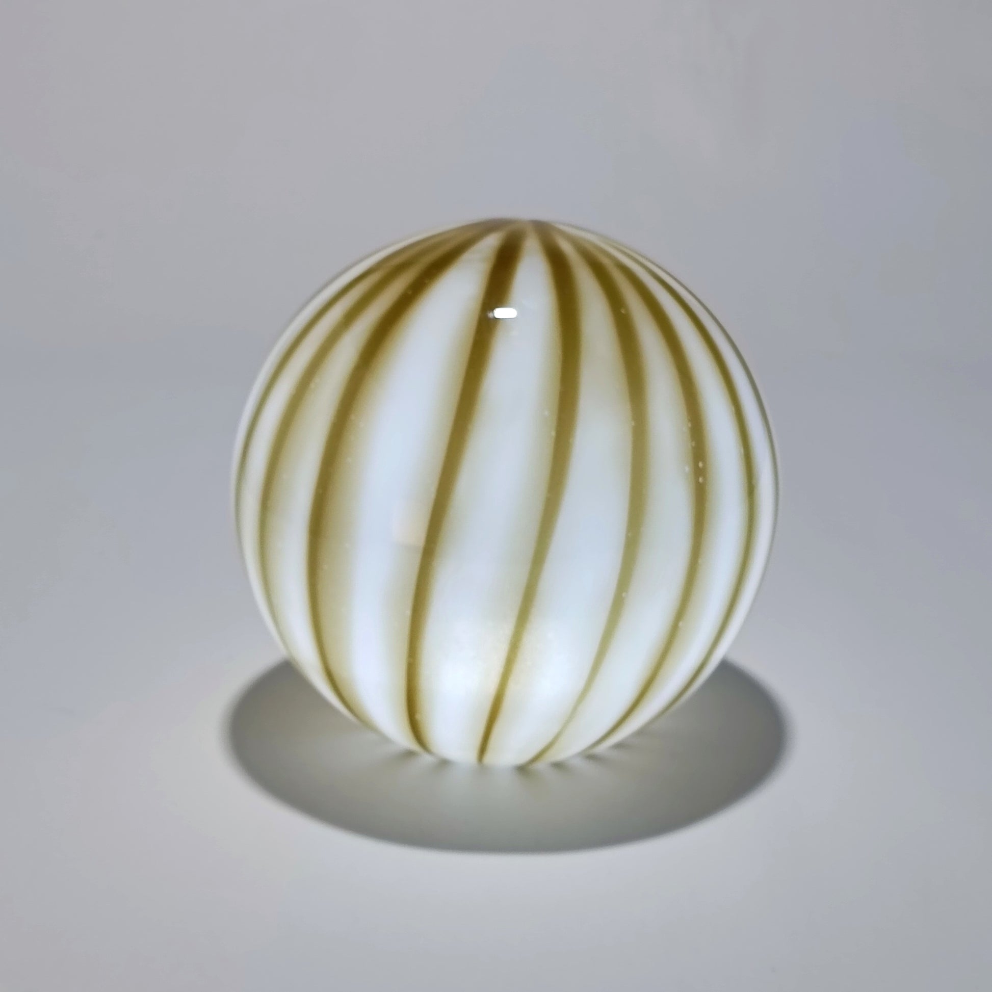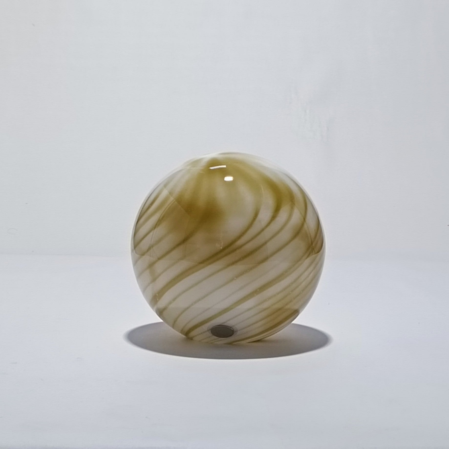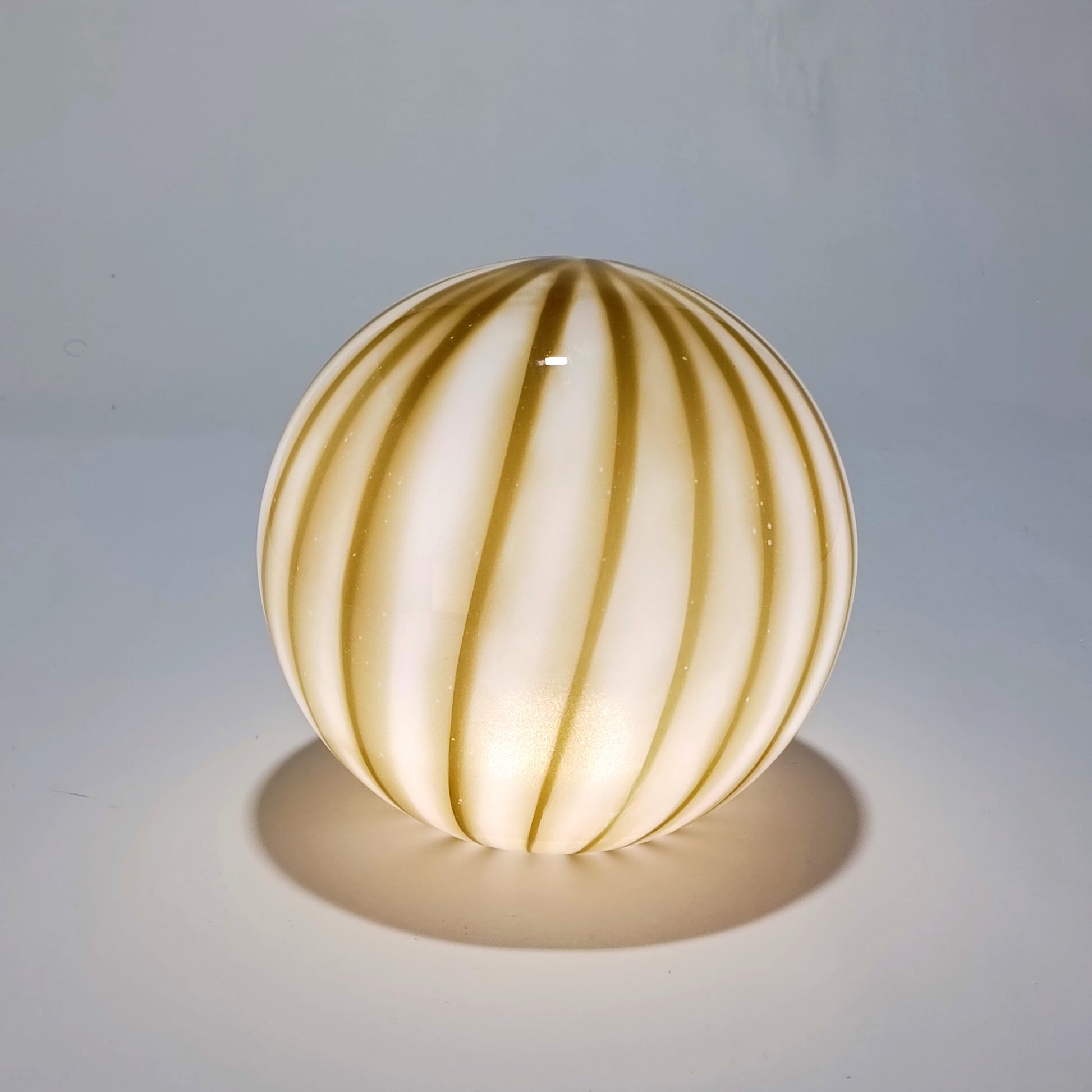 Lámpara de mesa inalámbrica de cristal opalino, con rayas verticales verde oliva integradas en el propio cristal. La luz es difusa, suave y homogénea, ideal para crear iluminación ambiental en interiores.