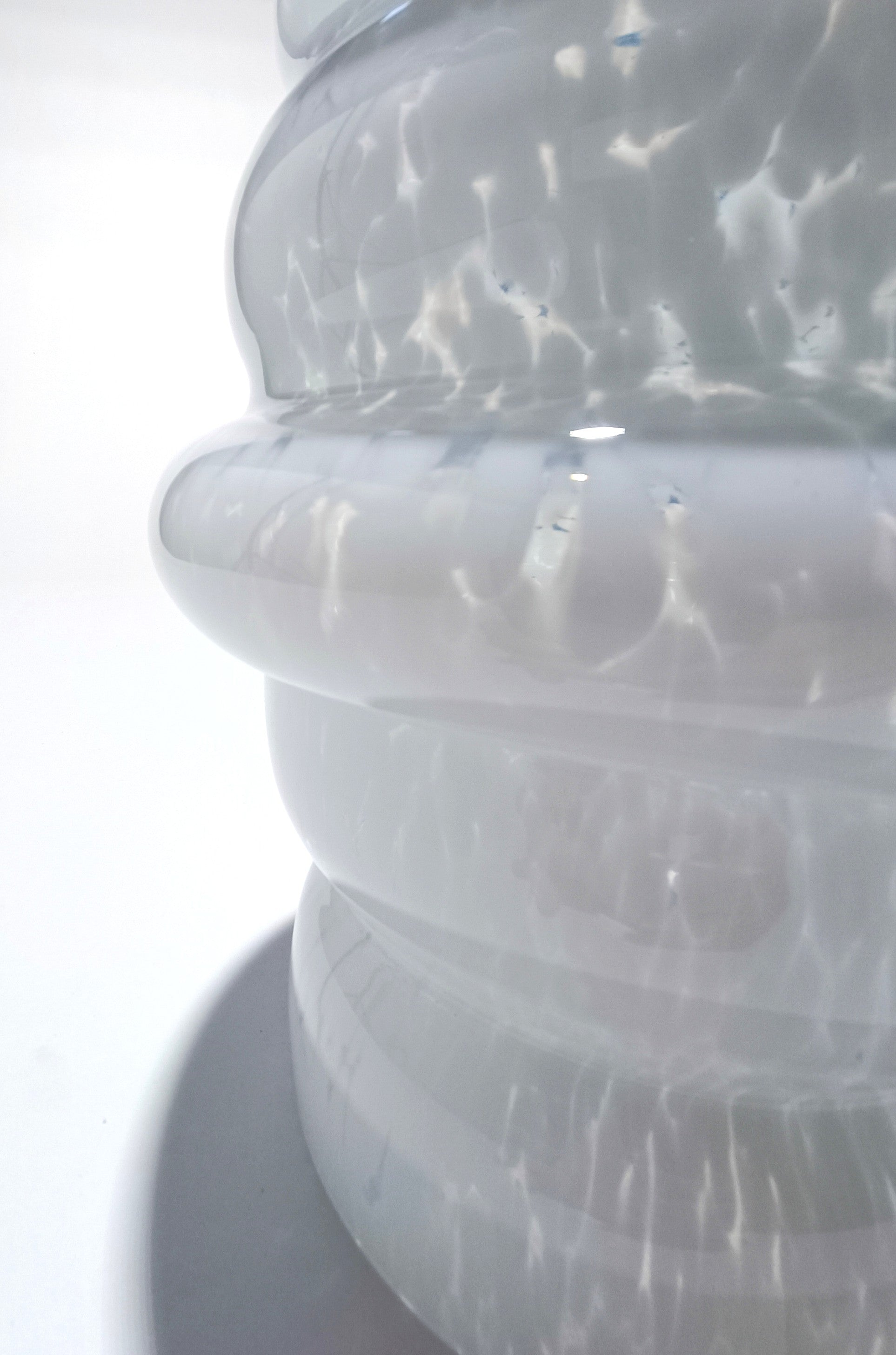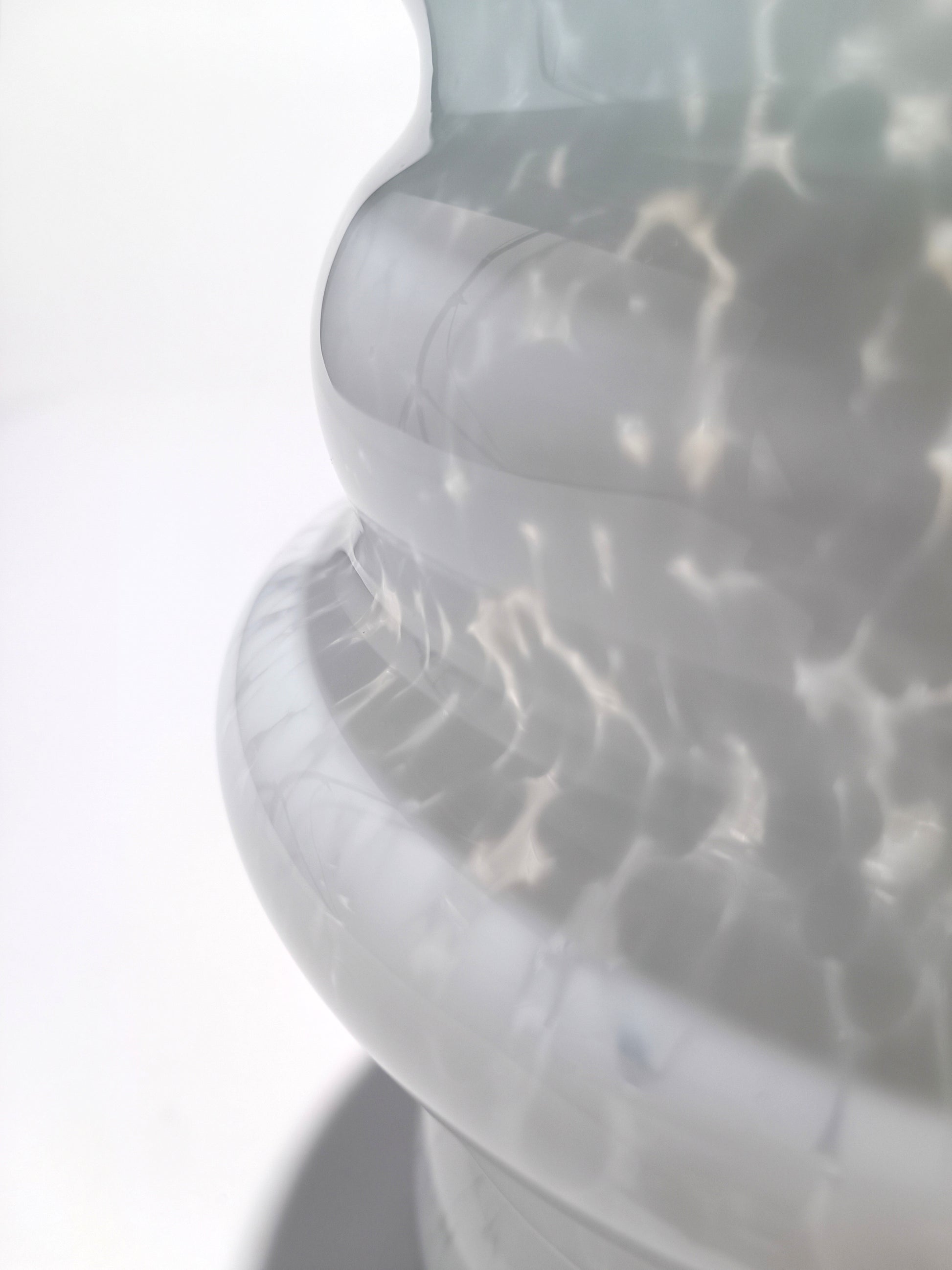 Vaso em vidro soprado manualmente, com 26 cm de altura e 20 cm de diâmetro. A forma ondulada dá-lhe presença e volume, enquanto o acabamento em grão branco cria reflexos decorativos muito agradáveis quando exposto à luz.