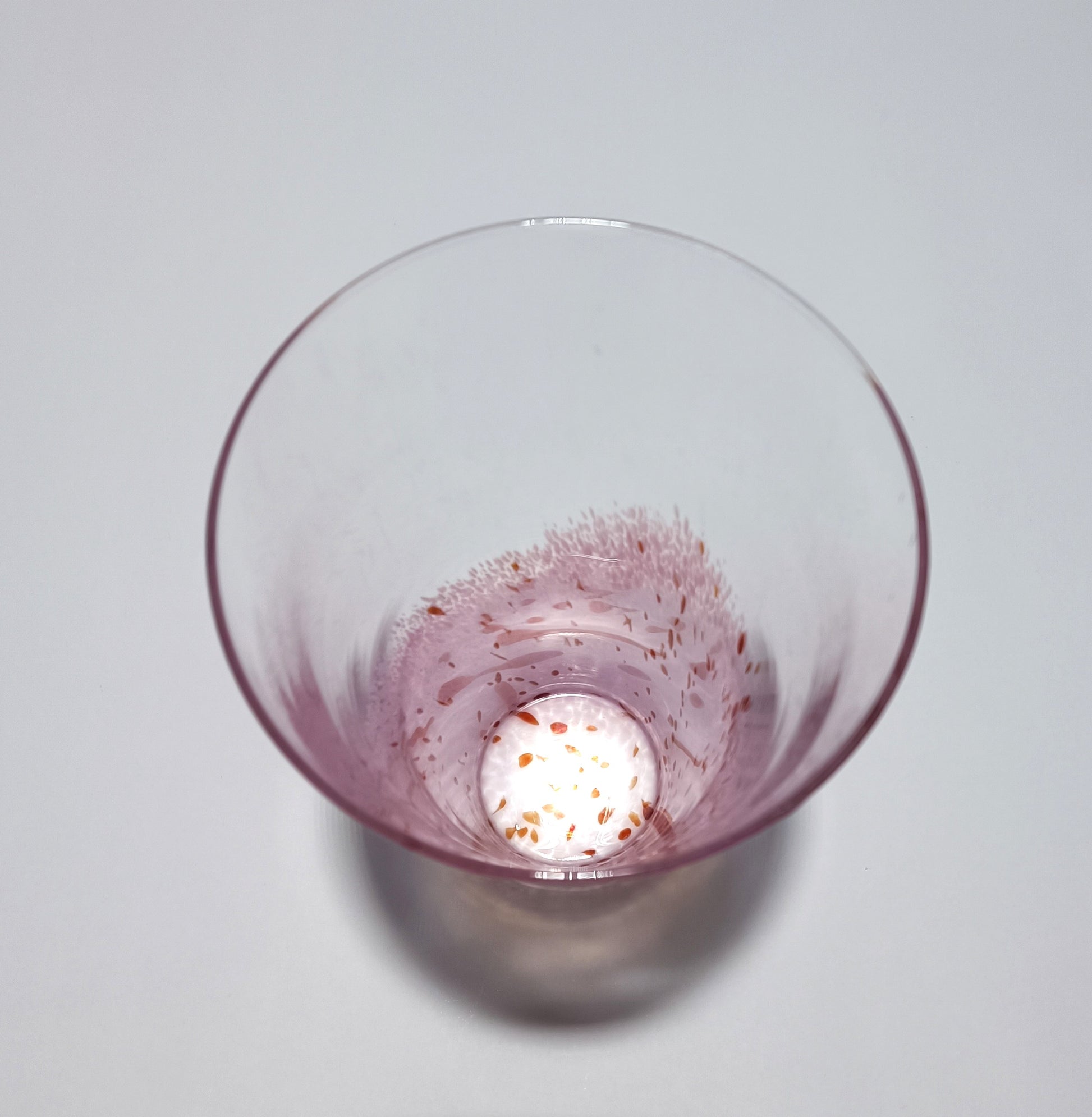 Diminutas partículas suspendidas danzan en el cristal, como polen atrapado en el tiempo. El tono rosa es suave, casi etéreo, lo que hace que este jarrón sea delicado sin ser frágil: una presencia silenciosa que transforma cualquier espacio.